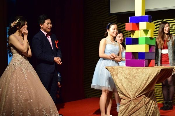 這玩法有點像桌遊會玩的木頭方塊疊疊樂很刺激。但婚禮是在舞台上,要讓現場賓客可以看得比較清楚。建議要另外DIY用紙盒做成放大版的長方塊唷,這樣就會比較有效果喔。