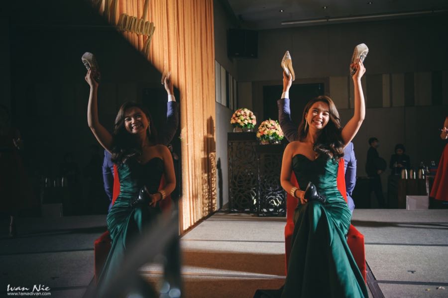 另如這場在艾美的婚禮,我們的遊戲是讓新人來考驗默契進行美式的舉鞋默契大考驗,題目設計的搞笑、幽默,自然而然台下的賓客也會非常熱衷參與,全場的至親好友全都哈哈大笑