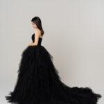 而那層層疊疊的蛋糕裙擺,無疑是這件婚紗的點睛之筆。每層裙擺都像是用最細密的黑天鵝絨與夢幻的薄紗精心交織而成,蓬鬆且富有質感。隨著新娘的輕盈步伐,裙擺如同黑色的海浪層層翻涌,靈動而大氣。行走間,它們相互交織、錯落有致,營造出如夢如幻的層次感,仿佛將新娘帶入一個童話般