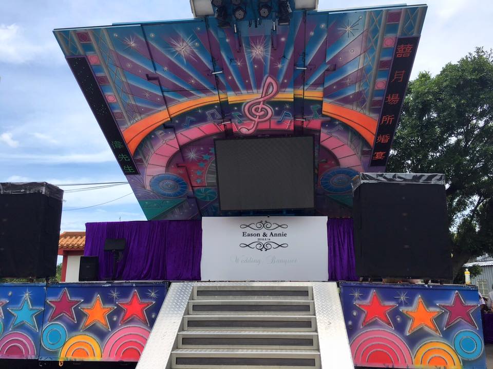 →舞台的形式有兩種,一種是基本的舞台,另外是俗稱的變形金剛舞台車的舞台。首先要看您的場地空間,太小的話舞台車是進不去的喔。舞台車的好處是舞台的燈光和音響設備都算是很齊全唷!
